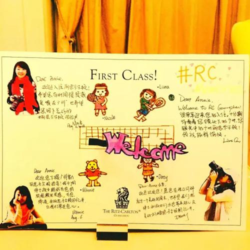 丽思卡尔顿酒店一直以服务著称,广州丽思卡尔顿酒店在给客人准备惊喜欢迎礼品方面一直非常用心。除了酒店吉祥物——有各式装扮的小狮子外,令人印象深刻的还有印有客人照片的相框,手工绘制的爱心卡片、大厨特别创作的具有当地特色的欢迎点心,以及通过与客人沟通了解后,针对其喜好而准备的纪念品等等。