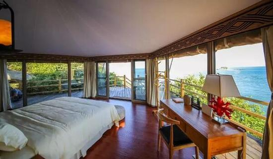 全木制的内饰最大程度的贴合自然,其中一间帐篷“听涛”还带有一个户外温泉池,一边泡温泉一边看海的帐篷,不知道你还在等什么。