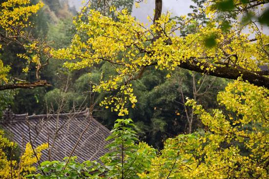 红枫丛中露出的飞檐翘角,影影绰绰,白墙黛瓦与金黄叶浪相映成趣,弥漫着诗意,沾染了画意。