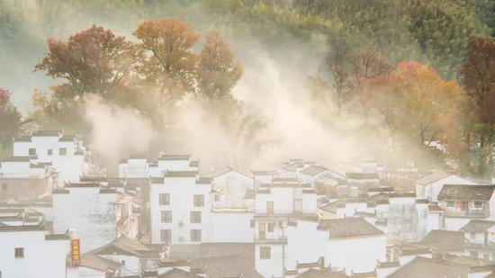 山谷里的雾气渐散时,丝丝薄雾飘在黑白民居之上,环绕着高大红枫,像一层薄纱,让人觉得恍如隔世。