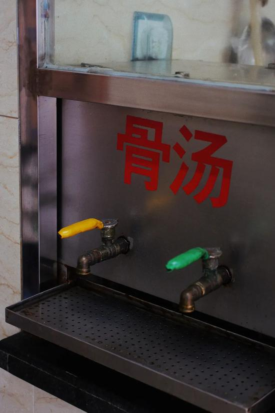 店里有这样一个自助佐料区,卤水、小菜、骨汤,想加什么自己动手就好。