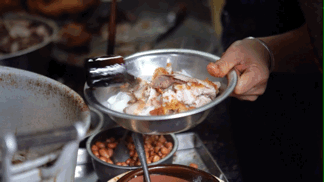 煮好的螺蛳粉里加上腐竹、木耳、酸笋、花生…再淋上橙红泛黄的螺蛳汤,一碗勾人唾液分泌的螺蛳粉就出现啦!酸、辣、鲜、爽的口味,绝对让你难以忘怀。