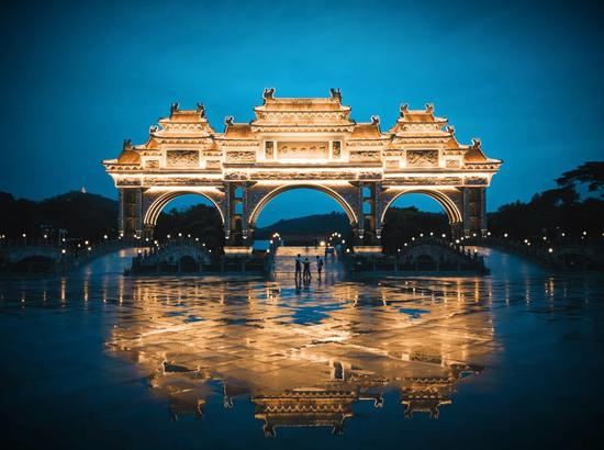 入口处这座牌坊,重1.4万吨,气势恢宏,是亚洲第一大牌坊。牌坊上用极精湛的石艺,刻上了一系列充满中华元素的雕饰。