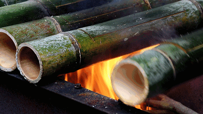 火堆边上,一个村民忙碌地往一端凿空的竹筒里填料——湿米、香菇、猪肉、干菜之类,塞得差不多了,便用木塞封住凿口,将它放到火堆上烤。