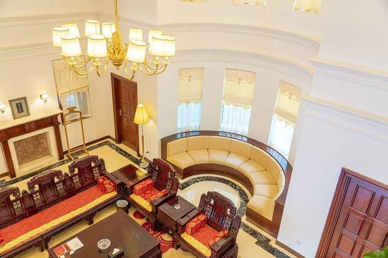 室内设计依旧选用印花墙纸和大理石砖,将内敛古典中式风格发挥到极致。