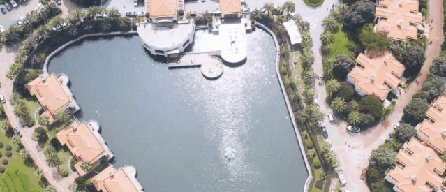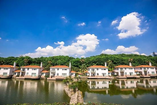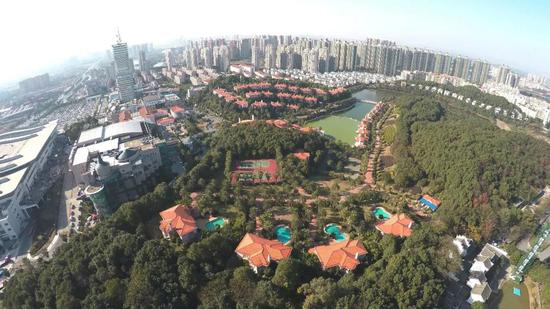 酒店在长沙单独辟出一块园林,由几十栋独立的别墅组成,别墅群依山傍水,空中俯瞰红砖房顶被绿植环绕,还以为是私家住宅区。