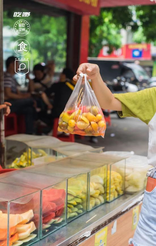 在钦州街头,总能看到端着酸嘢在路上边走边吃边跟朋友分享的年轻人们,在他们眼里,这才是吃酸嘢最正确的打开方式!