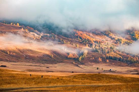 金色的阳光尽撒山谷,白色的毡房点缀其中,羊群牛群悠闲地吃着草,骑着马儿的牧民不慌不忙的走过,如此惬意,就连雾气都在这里变得缓慢。
