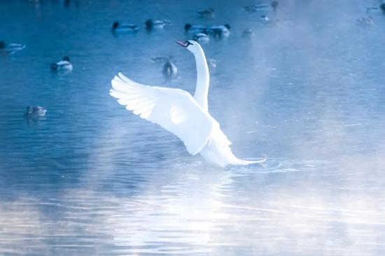 浓浓的雾,在树林化成素素的雾凇,晨曦初照,这些遗落在凡间的曼妙精灵,安详自在地在湖面上游弋。