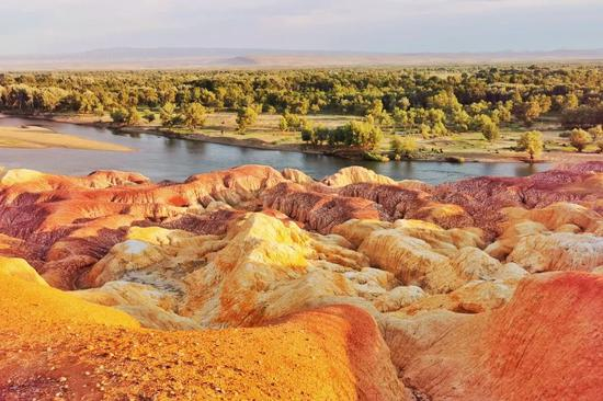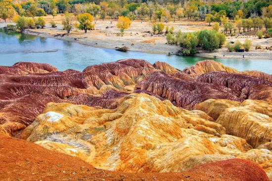 落日为远处的秋林加上了一层更为耀眼的滤镜,五彩滩也被洗刷的更加艳丽。