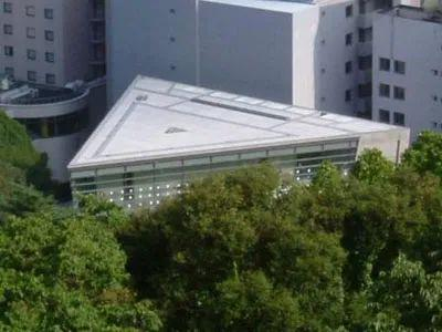 亚洲大学现代美术馆三角形的建筑设计理念是表示“环境、建筑、人”的三者平衡,三角形的表现不仅仅是建筑外在形式,建筑内部结构、採光井及灯具等的三角形概念更贯穿其中;材料方面大量采用了清水混凝土板。