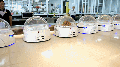 比如在海鲜机器人餐厅中,点好菜后会有机器餐盒从白色送餐道直接送到桌边,方便又干净。