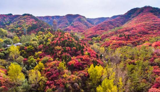 红枫、银杏、黄栌、柿树等等种类繁多的林木,每样有每样的色彩,交织在一起,让人眼花缭乱。