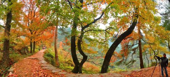 “北有香山红叶,南有南黄古道”。南黄古道修建于北宋末年,全长约12公里,是浙东重要的商贸通道,道旁枫树遍种,早在乾隆年间就享有盛名,被称为“南山秋色”。
