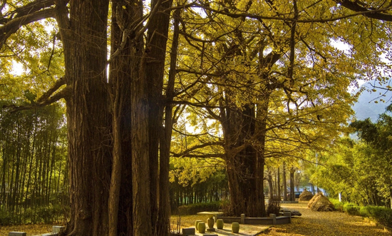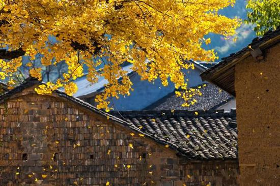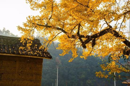 数千棵银杏树分布在村落人家的院子内,田埂边,小巷口。