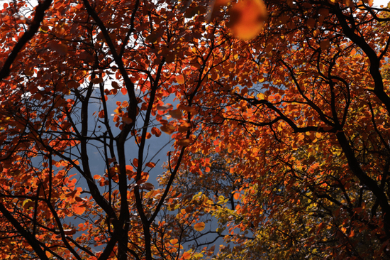 坡峰岭的红叶可近观,也可远眺。沿着小路慢慢往山上走的时候,就像是置身在一场秋天的红叶盛宴,遇到稍微开阔的地方远望,只见远处已经层林浸染,红黄相间,一路都能收获最丰盛的秋色。