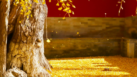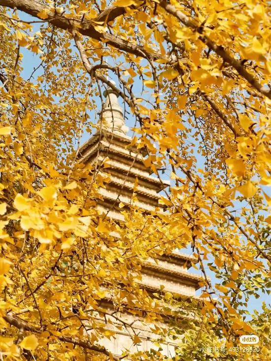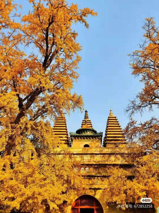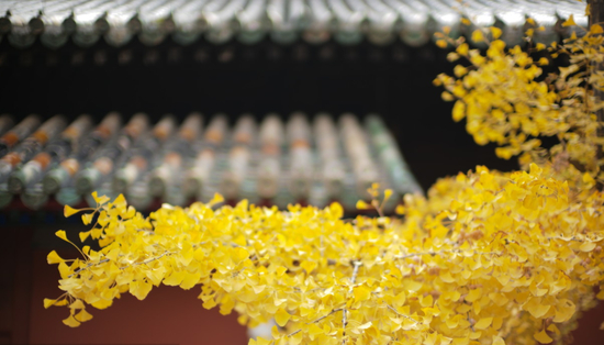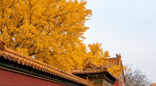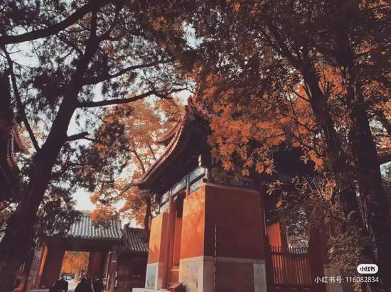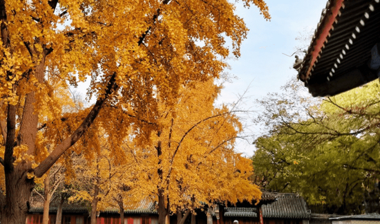 每当深秋,高大的树冠生长蔓延着,几乎遮蔽了大半个庭院,站在红墙黛瓦的寺院禅韵中望去,想象中古都积淀的秋韵都在这里了。