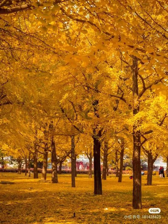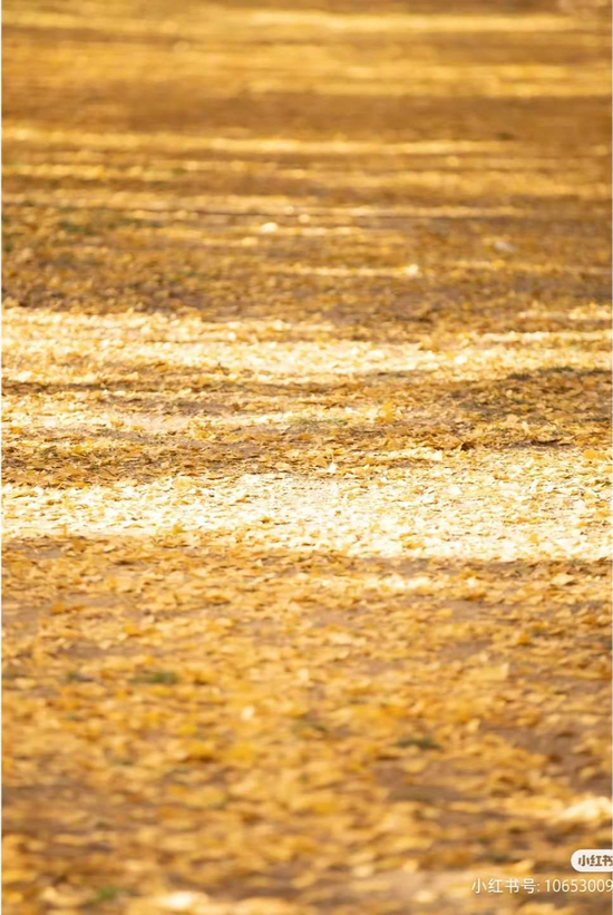 这里的树木没有像城市里一样在树干上刷着白漆,还全部都是它们最自然自在的样子,高大的银杏叶子几乎遮住了头顶的天空,地上也早已落了厚厚的一层,一走进去,眼里便只有一片金黄了。