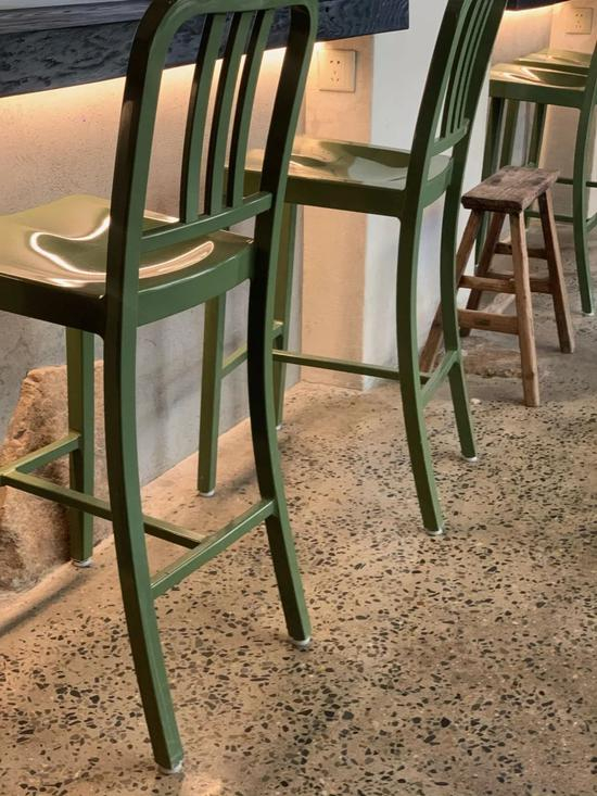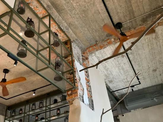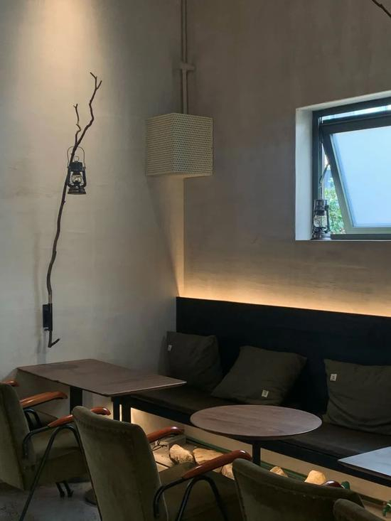 所以在店里能够找到许多bushcraft的元素,煤油灯、四处散落的鹅卵石、枯枝、斑驳露出砖块的墙面、水磨石地板。。。。。。却有着浓浓的工业风和,搭调不冲突。