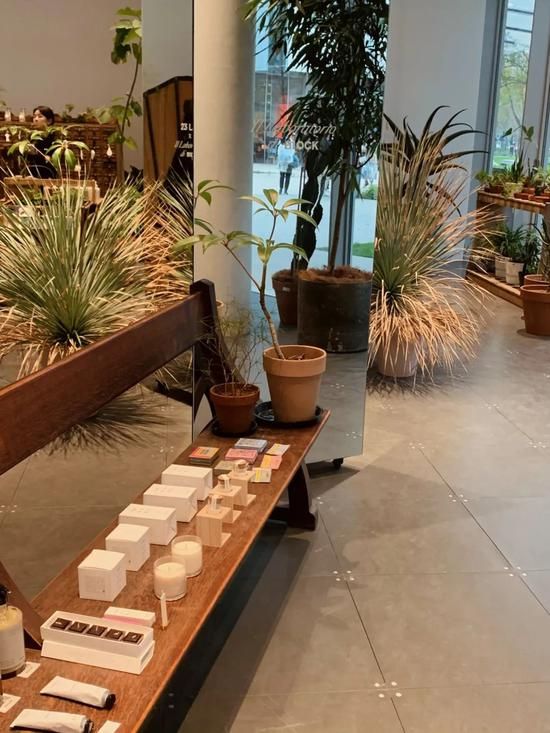 在对面的Il Laboratorio di B1OCK则是它们的生活方式概念店。各种香氛、有机产品,也有不少家居的摆件小物。有些年代感的长椅、木柜融入在绿植丛中,一派清新自然质感。