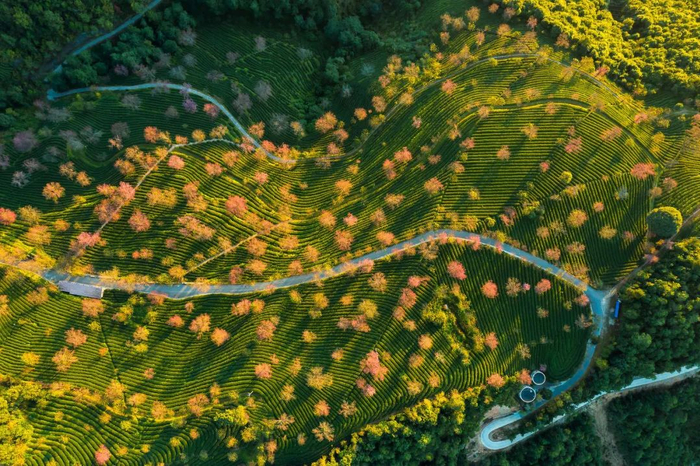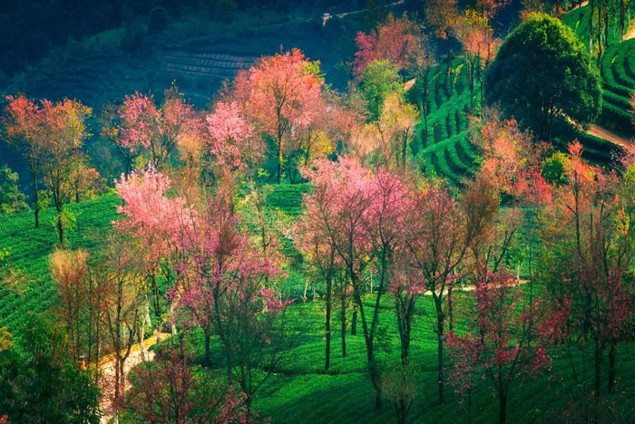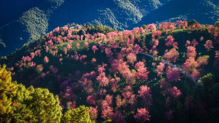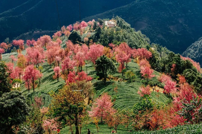 茶树依山势而栽,随山势起伏,像是一块翠绿色的地面,向远方绵延,冬樱点缀其中,俏丽的让人沉醉。