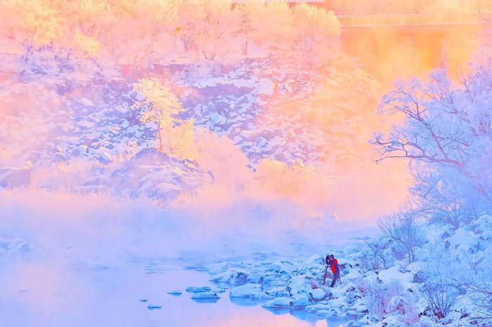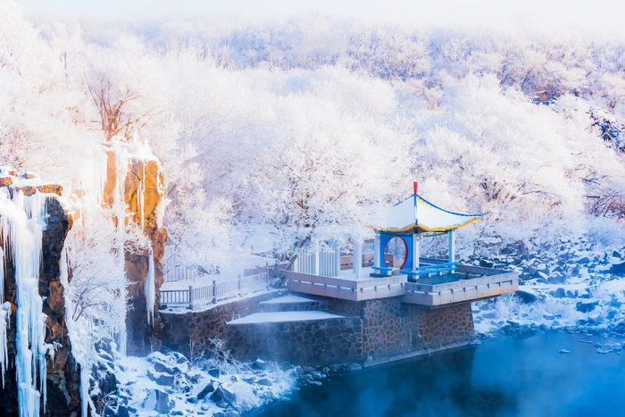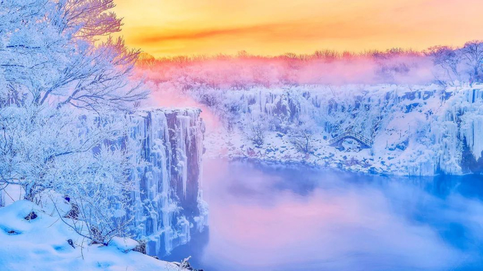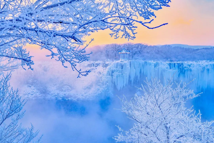 吊水楼瀑布自上而下结了冰挂,湖水升起腾腾雾气,阿波罗悄然从东方升起,这一刻,再多的语言也不足以形容它的美。