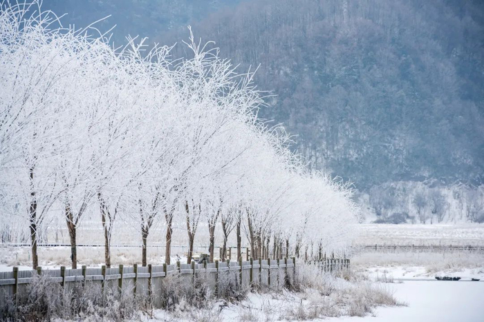 树木的枝杈上结上了冰霜,和吉林的雾凇想比,美的不相上下,就在这里走走,它褪去了夏季的翠绿,这个水墨的世界,也美的不可方物。