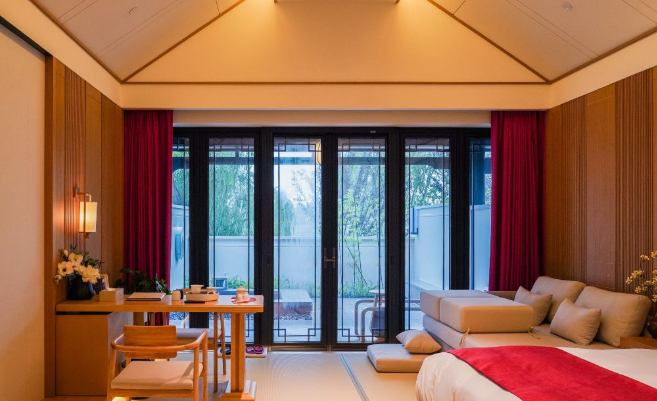 这家香樟华苹位于南京温泉胜地汤山,为全别墅房型,高高的墙壁围合起院落,私密性很好。你可以随时在院子里泡温泉,不用担心被打扰。