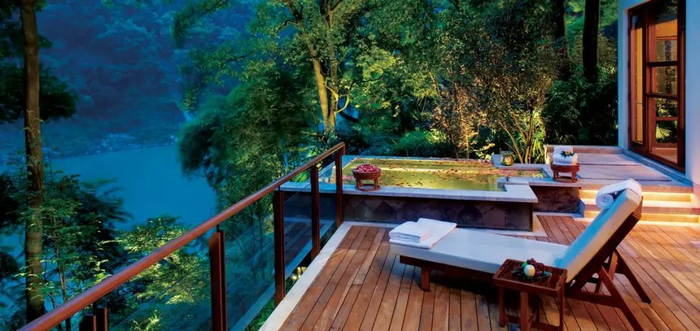 比悦榕庄更早相中北碚这块宝地的是柏联,酒店31栋别墅隐于山峦与嘉陵江水间,每间可享江景,在阳台上泡私汤。