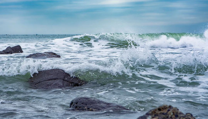 海水退潮的时候,大片黑色礁石渐渐露出来,像凝固的海浪。