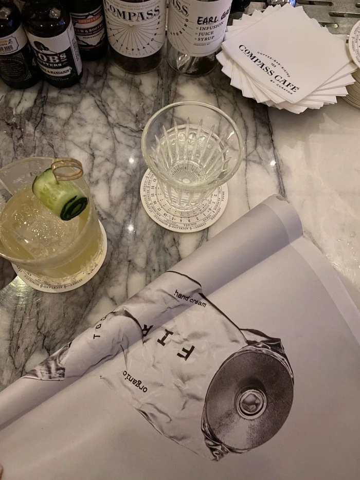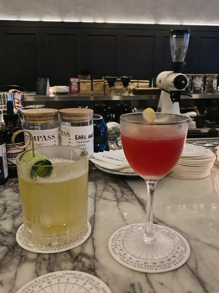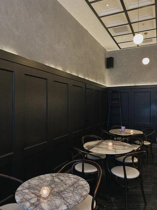 装潢走的是深沉的暗色调。高高的黑色护墙板,大理石圆桌搭配深色的曲线木椅,搭配出一种摩登的法式小酒馆风格,质感满满。加上店里的音乐,情调很棒。以店名compass罗盘设计的杯垫也很有趣。