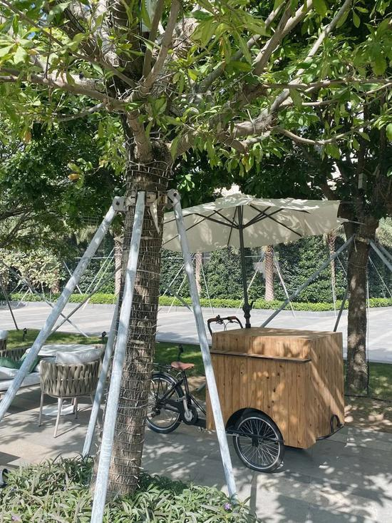 黑金的色调,很有高级感。户外伞下的座位,颇有种国外街头小馆的感觉。