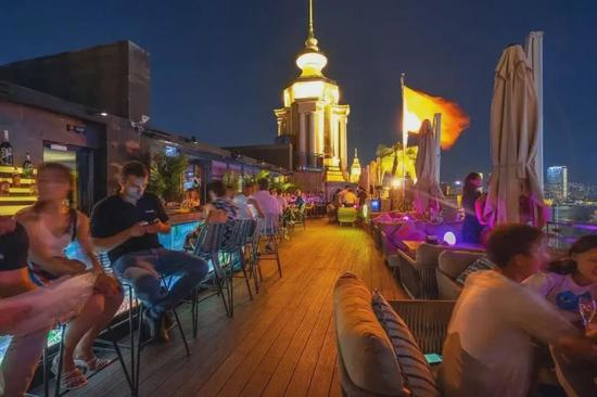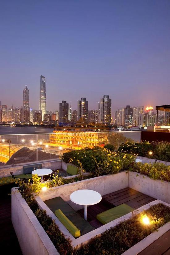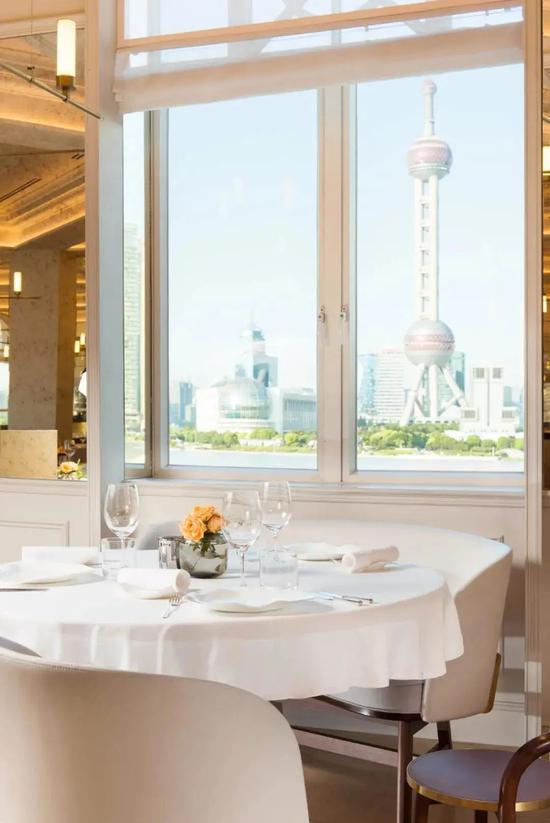 餐厅全景露台可一览外滩万国建筑群和陆家嘴风光。推荐夕阳落下时,坐在沙发区域小酌一杯,可以欣赏落日余晖。