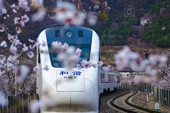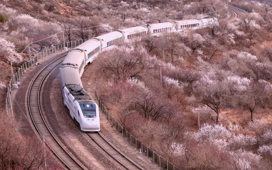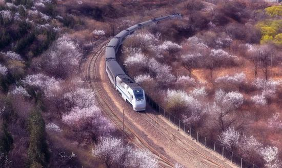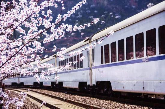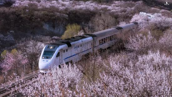 每当寒冰消融后,这里便一路繁花似锦,浅色的杏花、淡粉的山桃花依次绽放,和白色的列车相互映衬,成为春日里最亮丽的风景线。