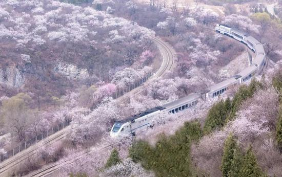 春天,它在居庸关穿越粉色花海;夏天,它在层峦叠翠的绿波间穿梭;
