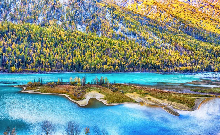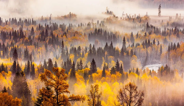 喀纳斯的色彩,喀纳斯占据了一部分,但是绝大部分还是要看彩林的发挥。春秋时它是活泼的,绿出万种可能;秋冬时它是厚重的,你能在这里看到数十种色彩。