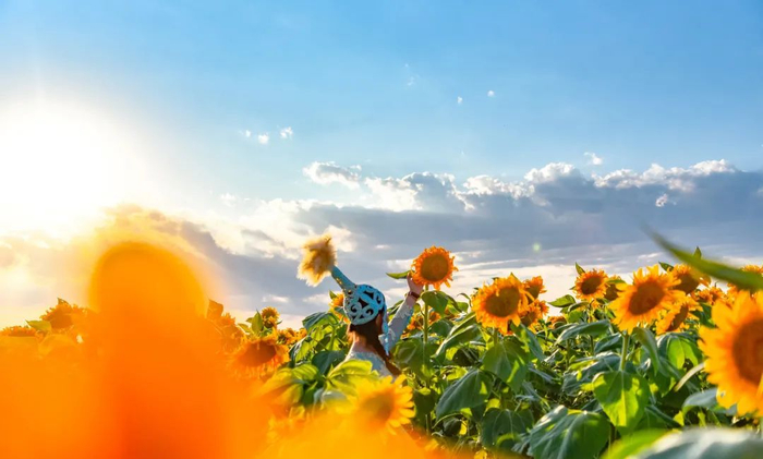 八月,视线聚焦在阿勒泰向日葵。大片黄洋洋的向日葵,与远处绵延的山,头上油画般的蓝天白云,一同绘制了一部,只有在童话世界里才能看得到的模样。