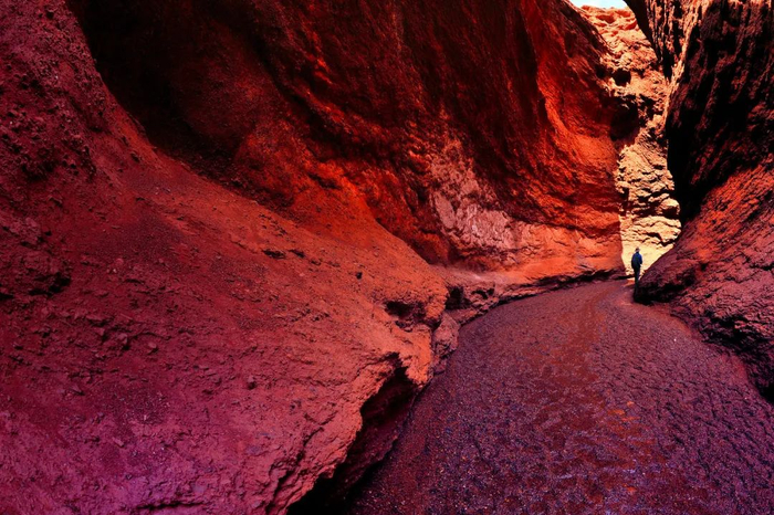 别看库车大峡谷是热艳的火红,进入谷内在红褐色的山峦中步行,体感直接下降好几度,仿佛进入了一个幽静清凉的世界。