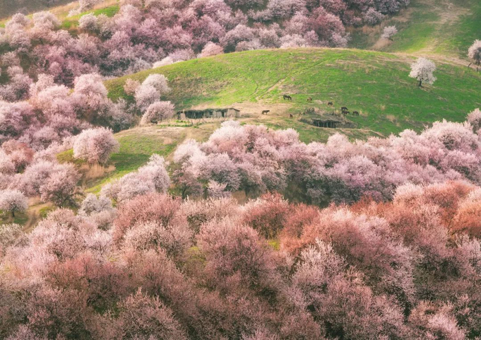 四月的伊犁杏花沟,有着春的娇羞。但小家碧玉新疆决不干,野杏花绵延十几公里,霸占了3万多亩地皮,排山倒海的气势谁看了不称一声绝。