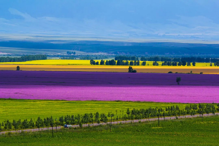 然后没多久万亩紫苏花也会竞相盛放,和油菜花交相呼应,周围是翠绿的草原,趁着湛蓝的天,真的像一幅油画。