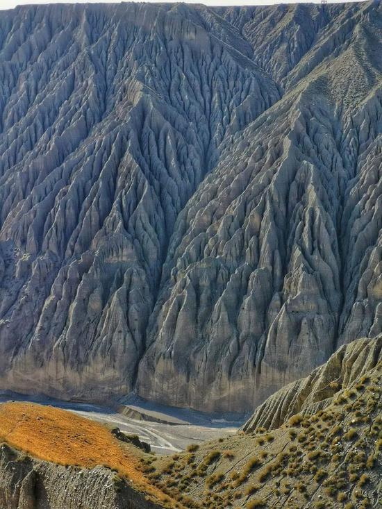 出发,是独山子大峡谷,亿万年河水切割、风雪侵蚀,两岸山崖,沟壑纵横,一道道褶皱,锋利如刀刻,令人心惊胆寒。