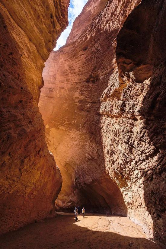 当你穿行于火红的山岩,头顶湛蓝清透、流云浮动。身旁,沁人的清凉,仿若一股巨大而神隐的生命力,席卷而来,亿万年沧海桑田的壮美,直抵深心。