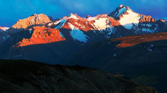 当天色渐暗,站在隧道口的悬崖边缘,放眼四望,高耸入云的峰顶,冰雪覆盖,银光闪烁。