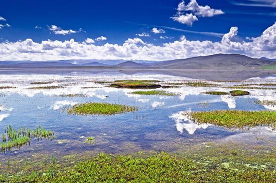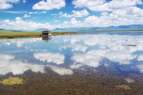 你可以去尕海湖,守望最宁静的天空之镜,看那净透的湖面,倒映一整个世界的云,看湖面上葱茏嫩绿的水草,一动不动地生长着,看大朵大朵的白云,凝固在远方连绵的山峦上。