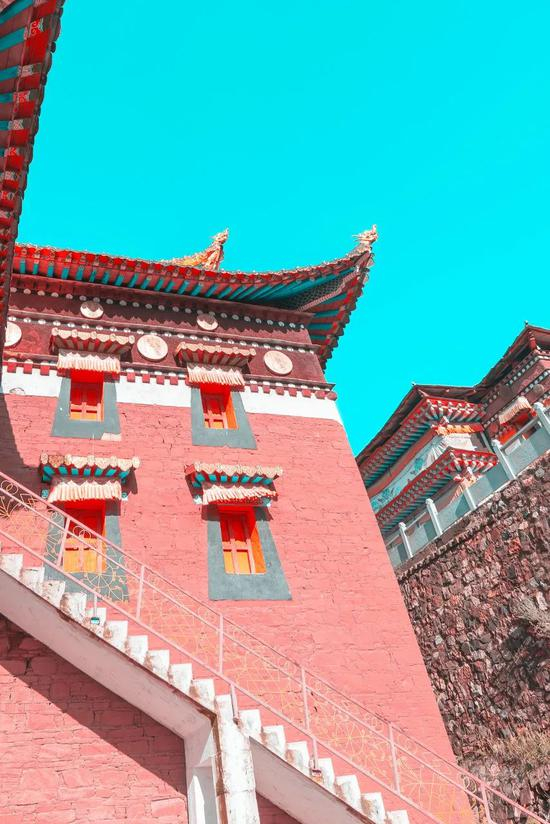 它安静地坐落在日光倾城中,与世无争,身着红色袈裟的僧侣,来来往往,仿佛和寺庙融为一体。