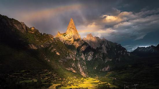 天朗气清后,壮阔的景致在眼前铺展——天地浩荡,宛如巨大山岩构筑的宫殿,气势恢弘。四周的山岩绝壁,陡峭嶙峋,尤为壮观,山林蓊郁、草地错落,一座座安静的村寨静卧其中,袅袅云烟,在半空缭绕,烘托出一派岁月静好的绝世画卷。