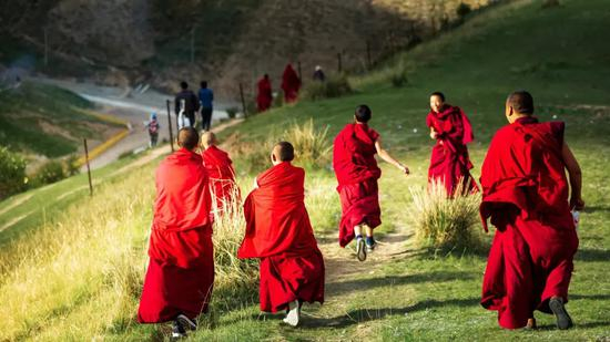 红袍僧人,在浓绿的草原上忽隐忽现。