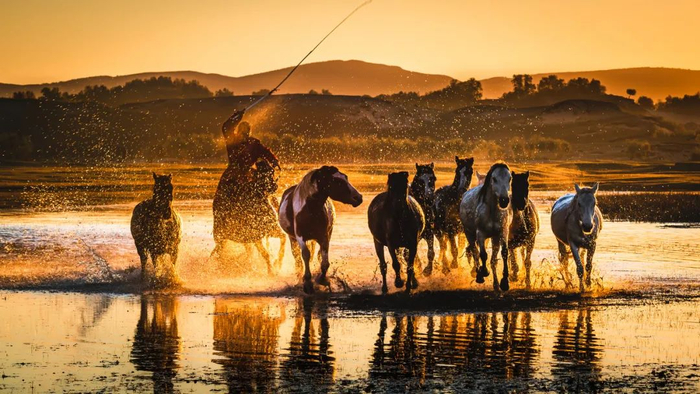 清凌凌的河湾里,马蹄踏起点点水花,牛羊沿着河流暮归。