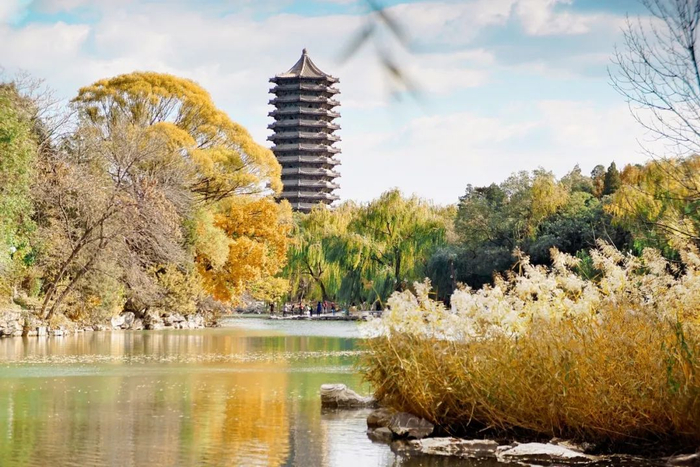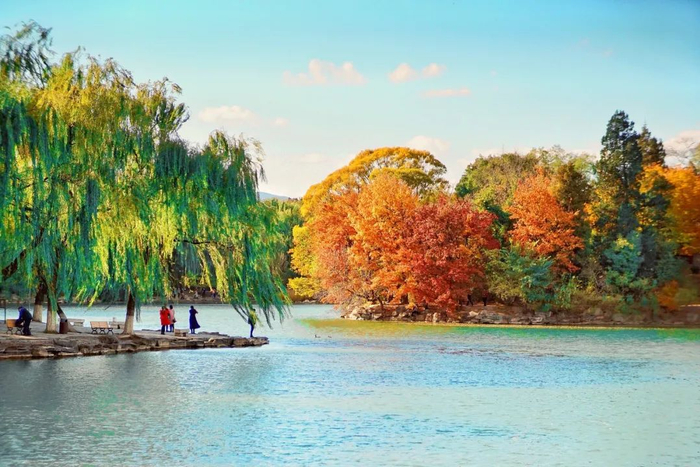 秋日的圆明园,映照在暖阳下,湖面平静,柳枝被挂上秋韵。