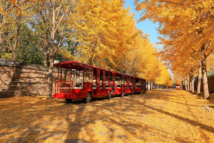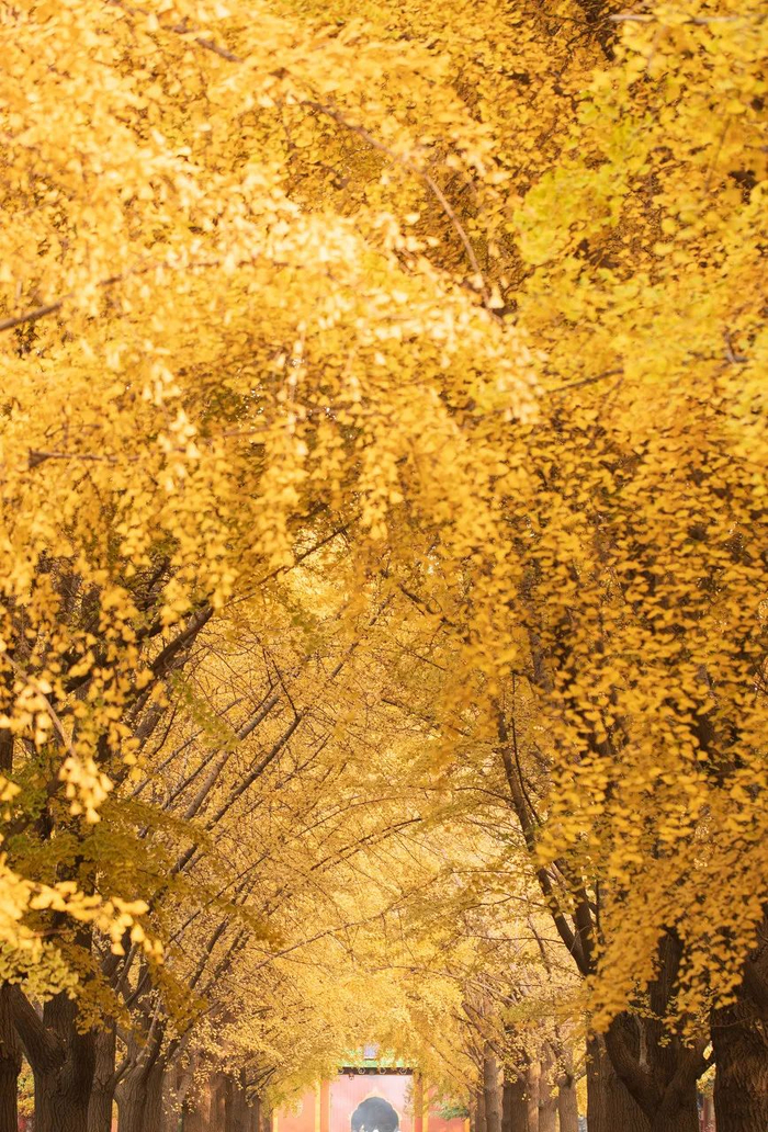 入口处的银杏大道是京城三大银杏大道之一,纯净的金色,从地面一直蔓延到天上。